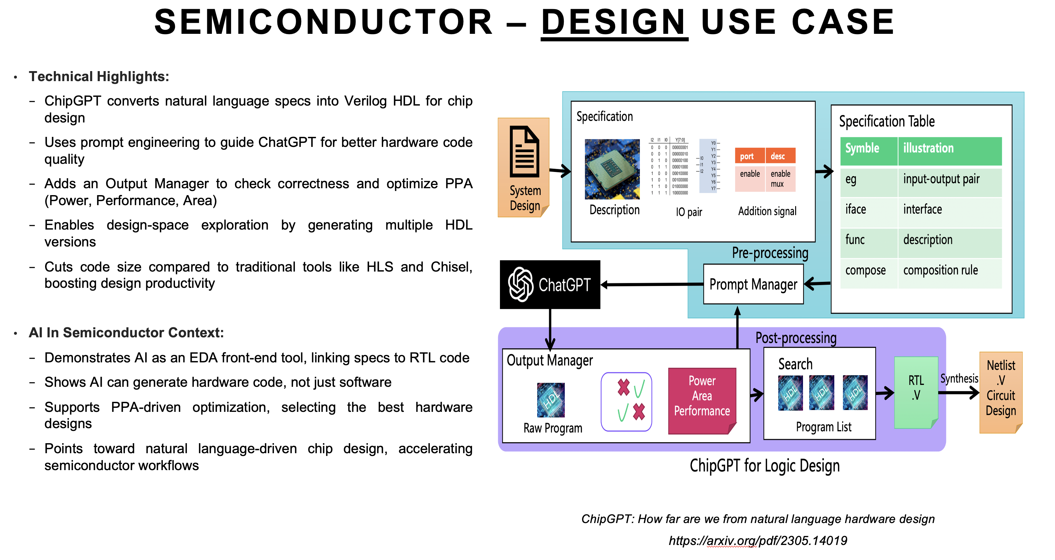 Across the lifecycle, AI is stepping in to tackle some of the industry’s most complex challenges. In design, tools like ChipGPT are translating natural-language specifications directly into Verilog code, helping engineers move from ideas to functional designs with remarkable speed. In verification, AI models can auto-generate testbenches and assertions, reducing the manual burden and ensuring higher functional coverage, traditionally one of the biggest bottlenecks in chip development.
